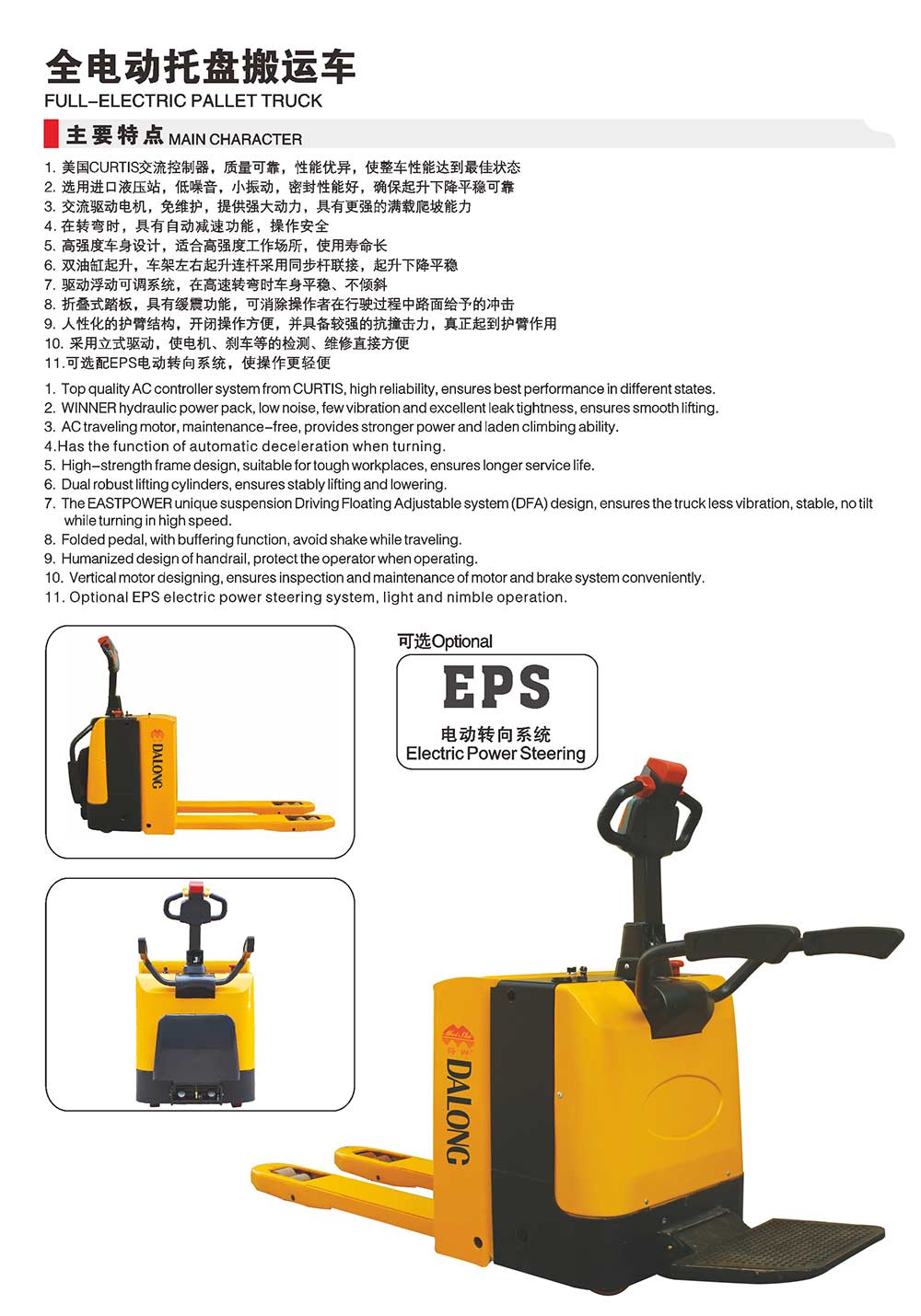 電動(dòng)托盤搬運(yùn)車是一種在國(guó)內(nèi)外應(yīng)用廣泛且市場(chǎng)潛力巨大的輕小型倉(cāng)儲(chǔ)工業(yè)車輛。它以蓄電池為動(dòng)力,直流電機(jī)驅(qū)動(dòng),液壓工作站提升,操縱手柄集中控制,站立式駕駛。電動(dòng)托盤車作業(yè)方便、平穩(wěn)、快捷;外型小巧、操作靈活;低噪音、低污染,能在商場(chǎng)、超市、倉(cāng)庫(kù)、貨場(chǎng)、車間等場(chǎng)所作業(yè),尤其適合食品、紡織、印刷等輕工行業(yè)使用。